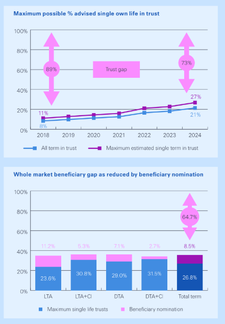 According to the report, there has been minimal progress in the last year, with policies in trust increasing 3.2% percentage points up to 21.4% of all new term plans including joint life, equivalent to 26.8% of single own life policies in 2024.