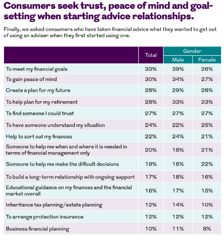 Overall, the key findings indicated that when working with an adviser, consumers highly valued support in achieving their financial objectives, reassurance, and assistance in developing a robust financial plan.